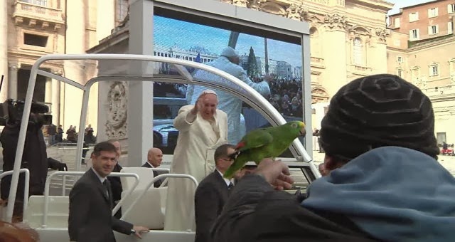 A few days after Francis had two children let go of two ‘peace’ doves, from the Apostolic window, which were in turn attacked by a seagull and a crow another incident took place concerning Francis & a bird. During his general audience on Wednesday, Francis had the Pope-mobile double-back so he could bless a parrot he saw in the crowd. Francis took the bird on his finger made a few remarks about its plumage and had his photo-op. The parrot was named Amore, in English (to) love, and repeated the word which the audience was chanting, “Papa!” The bird belonged to an interesting person named Francesco ‘Ghyblj’ Lombardi.