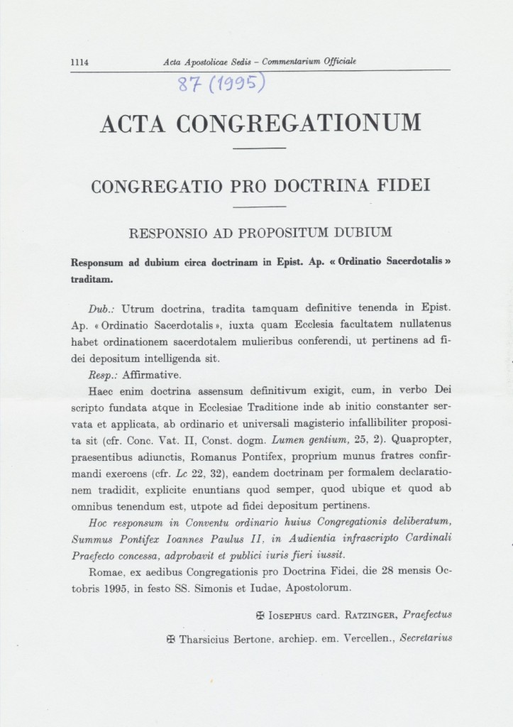 Bo mówi o tym, że dziewczyny mogą być dopuszczone do posługi, a zaraz potem wyjaśnia to, że celem tej posługi jest właściwe wdrożenie posługujących do ich przyszłego stanu kapłańskiego. Dodatkowo, można by zrozumieć, że sam papież miałyby podważać tym dokumentem swoje własne nauki, gdzie bezapelacyjnie negował prawo kobiet do kapłaństwa.