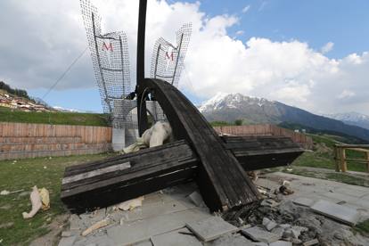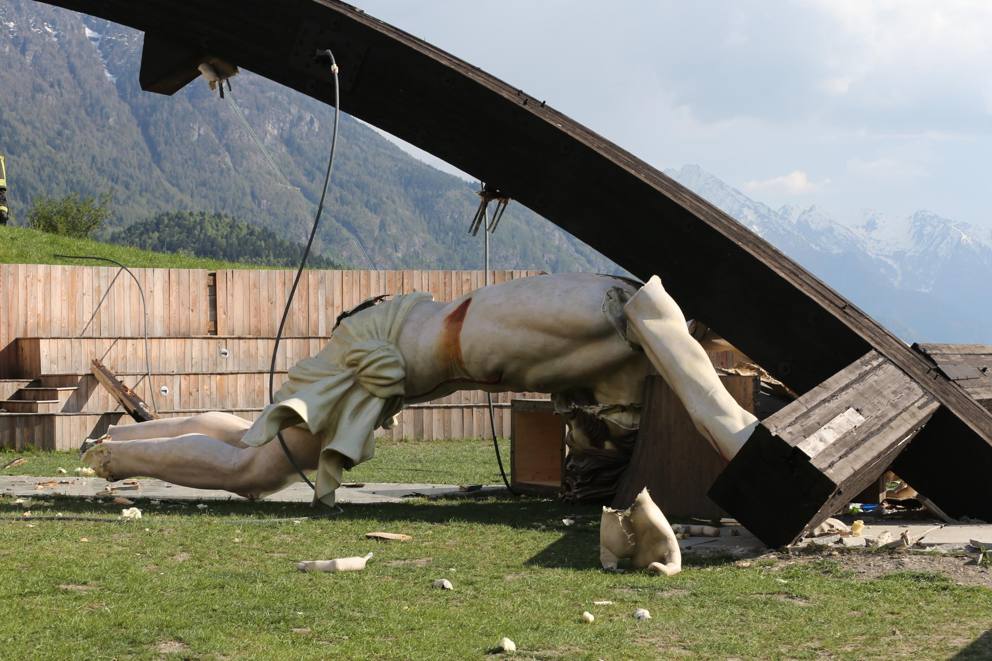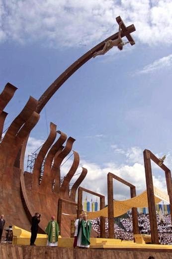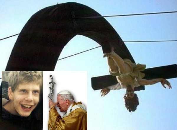 Pisząc te słowa otrzymaliśmy wiadomość i zdjęcia o tragedii we Włoszech. Młodzi mężczyźni poszli pod krzyż wojtyłowy (stworzony przez satanistów średniowiecznych) celem sfilmowania oblicza Chrystusa na tym krzyżu. Tak krzyż jak i figura mają charakter prowokacyjno – obsceniczny , co jest obecnie w modzie, a co jest i zasługą Jana Pawła II, bo to on był głównym reklamiarzem tego obraźliwego symbolu. Ofiara wypadku stojąc prosto pod dekadencko przegiętym krzyżem miała rzekomo filmować oblicze figury. Wtedy właśnie konstrukcja nośna krzyża pękła i figura uderzyła fotografa. Świadkowie utrzymują, ze ofiara utrwaliła na swej kamerze video własną śmierć.