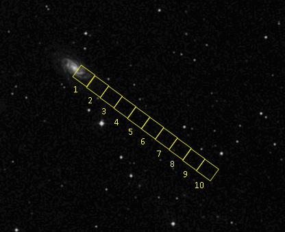 From the photo taken from the Internet of the galaxy NGC 2998, with the presence of dark matter 1 , well established by astronomers , rectangles were cut out, the outline of which is shown in the picture in fig. 1. From the rectangles the signal of torsion field particles was transferred to vials with water, which were then examined with a spectoscope .