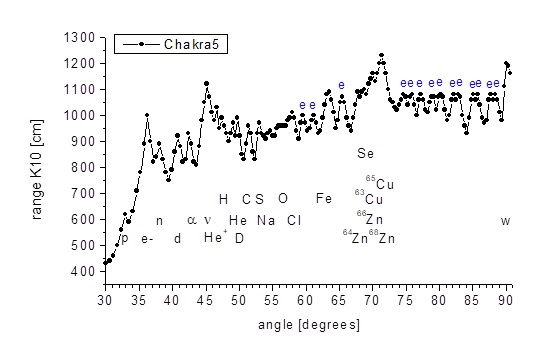 Fig. 11. Spectrum of the torsion field particle signal taken from the area of ​​the heart chakra and from the arm of a person with the natural ability to attract metal objects. Markings: chakra5 - heart chakra signal, shoulder - shoulder signal, p - protons, e- - electrons, n - neutrons, d - deuterons, α - alpha particles, ν - neutrinos, He + - ionized helium molecule, He - helium, H - hydrogen, D - deuterium, C - carbon, S - sulfur, O - oxygen, Na - sodium, Cl - chlorine, Fe - iron, Cu - copper, Zn - zinc, Se - selenium, w - WIMP- y. e - signal from aromatic amino acid rings. Axis of absences - the angle of the incident beam relative to the breaking plane, measured in degrees; ordinate axis - range of Category K10 radiation from samples at the output of the spectroscope, measured in centimeters.