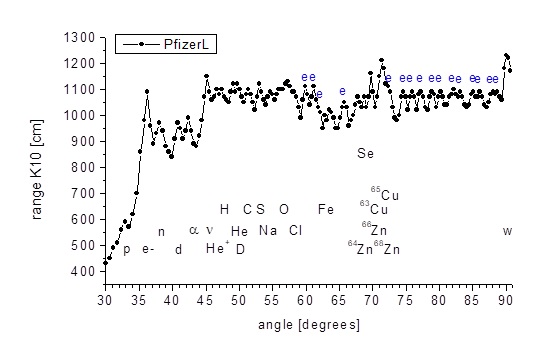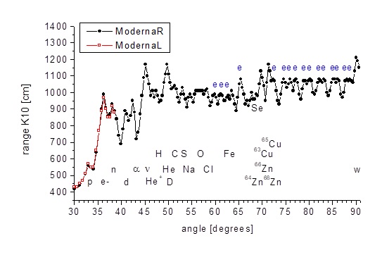 Från graferna i Fig. 14 och 15 kan vi se att i både Moderna- och Pfizer-vaccinerna aktiveras samma koppar-zinkenzym i kroppen, dvs med samma mönster av signaler från aromatiska ringar i vinkelområdet i diagram 72 ° -82 ° specifikt för ett specifikt koppar -zinkenzym associerat med ett specifikt chakra. Det är också samma enzym som förekommer hos en person med den naturliga förmågan att attrahera metallföremål och samtidigt i K5 (hjärt) chakrat hos en person utan exceptionella paranormala förmågor. I båda fallen finns det en biologisk kärnreaktion och närvaron av WIMP som ansvarar för att locka metaller.