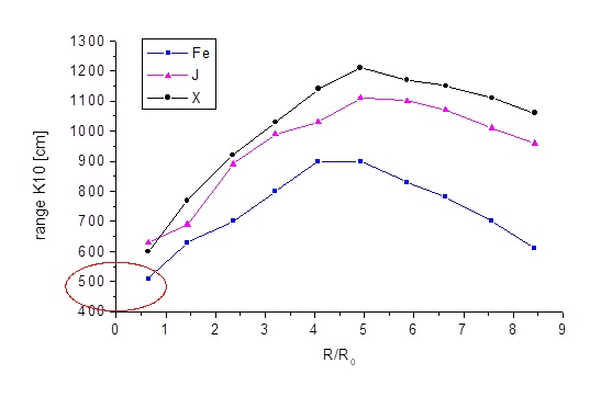 Fig. 3. The intensity of signals from the photo of the galaxy NGC 2998 depending on the distance from the galaxy's center. Blue squares - iron (Fe) signal, purple triangles - iodine (J) signal, black circles - signal of unknown substance X at the very end of the curves in Fig. 7. The relative values ​​of the individual signals were retained. The chart shows the size of the galaxy with an optical ellipse. The abscissa axis - the ratio of the distance of the measurement field center from the galactic center to the galaxy's radius, ordinate axis - the range of Category K10 radiation from the samples at the output of the spectroscope, measured in centimeters. 9