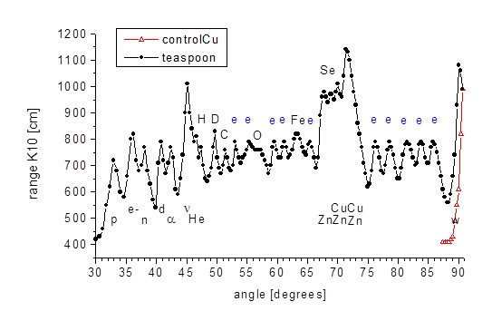 Fig. 5. The spectrum of the signal obtained from a stainless steel spoon bent with the use of paranormal abilities. The red line is the background level of the spectroscope, because the WIMP peak is near the limit of the measuring range. Markings: p - protons, e- - electrons, n - neutrons, d - deuterons, α - alpha particles, ν - neutrinos, He - helium, H - hydrogen, D - deuterium, C - carbon, O - oxygen, Fe - iron, Cu - copper, Zn - zinc, Se - selenium, w - WIMPs. e - signal from aromatic amino acid rings. Axis of absences - the angle of the incident beam relative to the breaking plane, measured in degrees; ordinate axis - range of Category K10 radiation from samples at the output of the spectroscope, measured in centimeters.