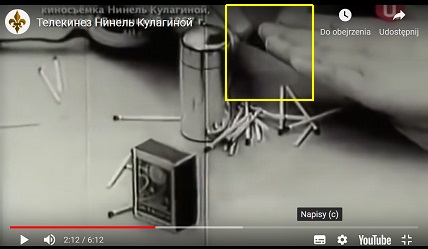 Låt oss nu kolla in några exempel på telekinesis. En intressant person i Sovjetunionen var Nina Kulagina, som hade flera paranormala förmågor. En särskild forskningscell inrättades för att studera fenomenet Kułagina. Efter tio års arbete av forskargruppen drog gruppen slutsatsen att Kulagina hade lurat dem hela tiden och att hon inte hade några paranormala förmågor. I Sovjetunionen kunde en annan ansökan inte skrivas. Fig. 6 visar en filmram för tillfället när Kulagina skjuter en metallcylinder (troligen tom inuti) på avstånd.