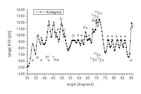 Fig. 7. The spectrum of the signal from the marked area of ​​the frame from the film about Kulagin, at which point one could expect information about radiation related to telekinesis. Markings: p - protons, e- - electrons, n - neutrons, d - deuterons, α - alpha particles, ν - neutrinos, He - helium, H - hydrogen, D - deuterium, C - carbon, O - oxygen, Fe - iron, Cu - copper, Zn - zinc, Se - selenium, w - WIMPs. e - signal from aromatic amino acid rings. Axis of absences - the angle of the incident beam relative to the breaking plane, measured in degrees; ordinate axis - range of Category K10 radiation from samples at the output of the spectroscope, measured in centimeters.