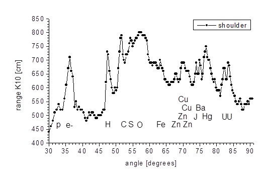 Fig. 9. Spectrum of the signal collected into the vial from the arm of a non-paranormal person (WM). Vial exposure time 20s. Marks p - protons, e- - electrons, H - hydrogen, C - carbon, S - sulfur, O - oxygen, Fe-iron, Cu - copper, Zn - zinc, J - iodine, Ba - bar, Hg - mercury, U - uranium. Axis of absences - the angle of the incident beam relative to the breaking plane, measured in degrees; ordinate axis - range of Category K10 radiation from samples at the output of the spectroscope, measured in centimeters.