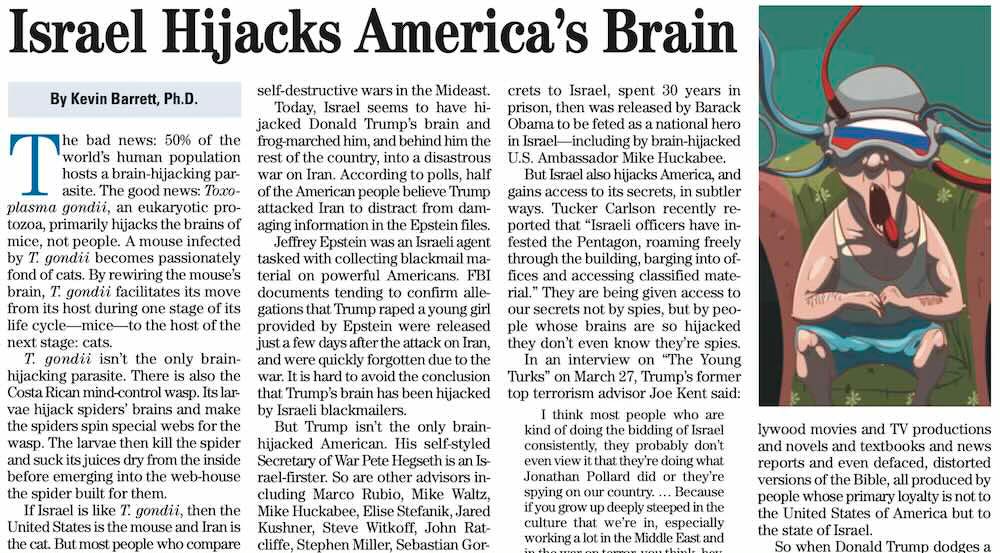 Wydaje się, że dziś Izrael przejął kontrolę nad mózgiem Donalda Trumpa i zmusił go, a za nim resztę kraju, do katastrofalnej wojny z Iranem. Według sondaży , połowa Amerykanów uważa, że Trump zaatakował Iran, aby odwrócić uwagę od akt Epsteina. Ponieważ Jeffrey Epstein był izraelskim agentem, którego zadaniem było zbieranie materiałów służących do szantażu wpływowych Amerykanów, a dokumenty FBI, potwierdzające zarzuty o gwałty na młodych dziewczętach, dostarczone przez Epsteina, zostały ujawnione zaledwie kilka dni po ataku na Iran i szybko zapomniane z powodu wojny, trudno uniknąć wniosku, że mózg Trumpa został przejęty przez izraelskich szantażystów.