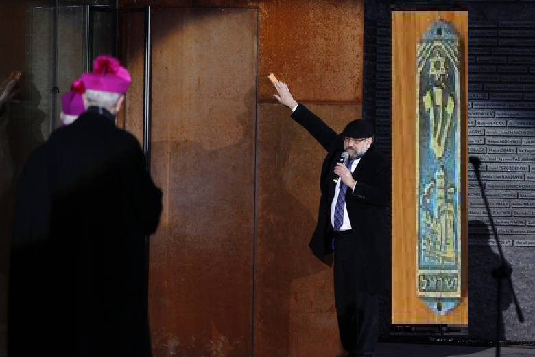 W przerażającej scenerii jak w Yad Vashem z centrum ognia w ciemnościach, przy którym Duda ze swoją koszerną żoną składa świeczki, stoją dwie biało ustrojone dziewczynki. Prawdopodobnie jest to symbol łatwego zniewolenia dzieci przez żyda, bo dziewczynki te jako samotne, są łatwe do opanowania przez dorosłego żyda. Zaraz potem przylatuje rabin Schudrich i dokonuje aktu zajęcia „muzeum” jako żydowskiej nieruchomości, która już nieodwracalnie należy do żyda. Robi to poprzez przytwierdzenie na drzwiach do „muzeum” mezuzy, która jest repliką mezuzy z Muzeum Historii Żydów Polskich POLIN. Rabin deklaruje akt przejęcia nieruchomości słowami: „Kiedy poproszono mnie o przybicie mezuzy w tym muzeum, pomyślałem „Oczywiście!”, bo to muzeum symbolizuje nasz wspólny dom.” Tym prostym sposobem żyd przejął od goja majątek wartości 9 milionów złotych plus wpływ z biletów od obowiązkowych wycieczek szkolnych i religijnych. Od tej pory każdy żyd wchodzący do muzeum będzie pieszczotliwie dotykał mezuzę, potem polskie dzieci będą dokonywały tego samego. I wkrótce zapewne w każdym polskim domu zawiśnie to żydowskie szkaradztwo na znak, że to dom również żydowski. Zaś jeżeli w „muzeum” jest miejsce dla Ulmów, to tylko takie, które nie jest zbyt duże i nie zakłóci żydowskiej "religijnej" wrażliwości zabitych żydów oraz żydowskich wycieczek. Nie może być mowy o symbolice chrześcijańskiej i o tym, że opisywana inspiracja pomocy - jakkolwiek zniekształcona - pochodzić by miała od katolickiego miłosierdzia wobec bliźnich – wszystkich bliźnich, wszystkich ludzi - ale jest w swym „nauczaniu” ukierunkowana na chrześcijański obowiązek służenia żydowi. Dokładnie tak, jak to powiedział rabin w Izraelu, że „chrześcijanin jest jak osioł, który jest po to, aby służyć żydowi”. A przy tym żydowskim koszmarze kosztownej scenerii nie wysilono się na jakieś lepsze uszanowanie mogiły Ulmów: leżą oni przykryci tanią, brzydką płytą nagrobkową typu lastryko, ich imiona są zapisane nieporadnymi krzywmy literami, wymęczonymi strudzoną ręką wiejskiego kamieniarza. Grób nie jest zadbany, nie został odnowiony, a jego błąd jest zasadniczy: symbol krzyża, który unosi się nad tą mogiłą, a co obraża religijną wrażliwość żyda.