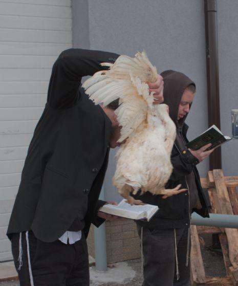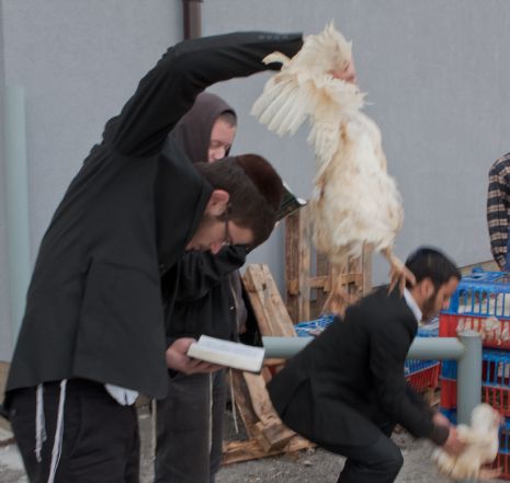 Kaparot is an ancient atonement ritual performed by Jews between Rosh Hashana and Yom Kippur. The ritual involves waving a chicken above one’s head while chanting a prayer for atonement. The chicken, which is meant to absorb all the sins of the person performing the ritual, is then ritually slaughtered and given as charity to a poor family, thereby transforming sin into good deeds.