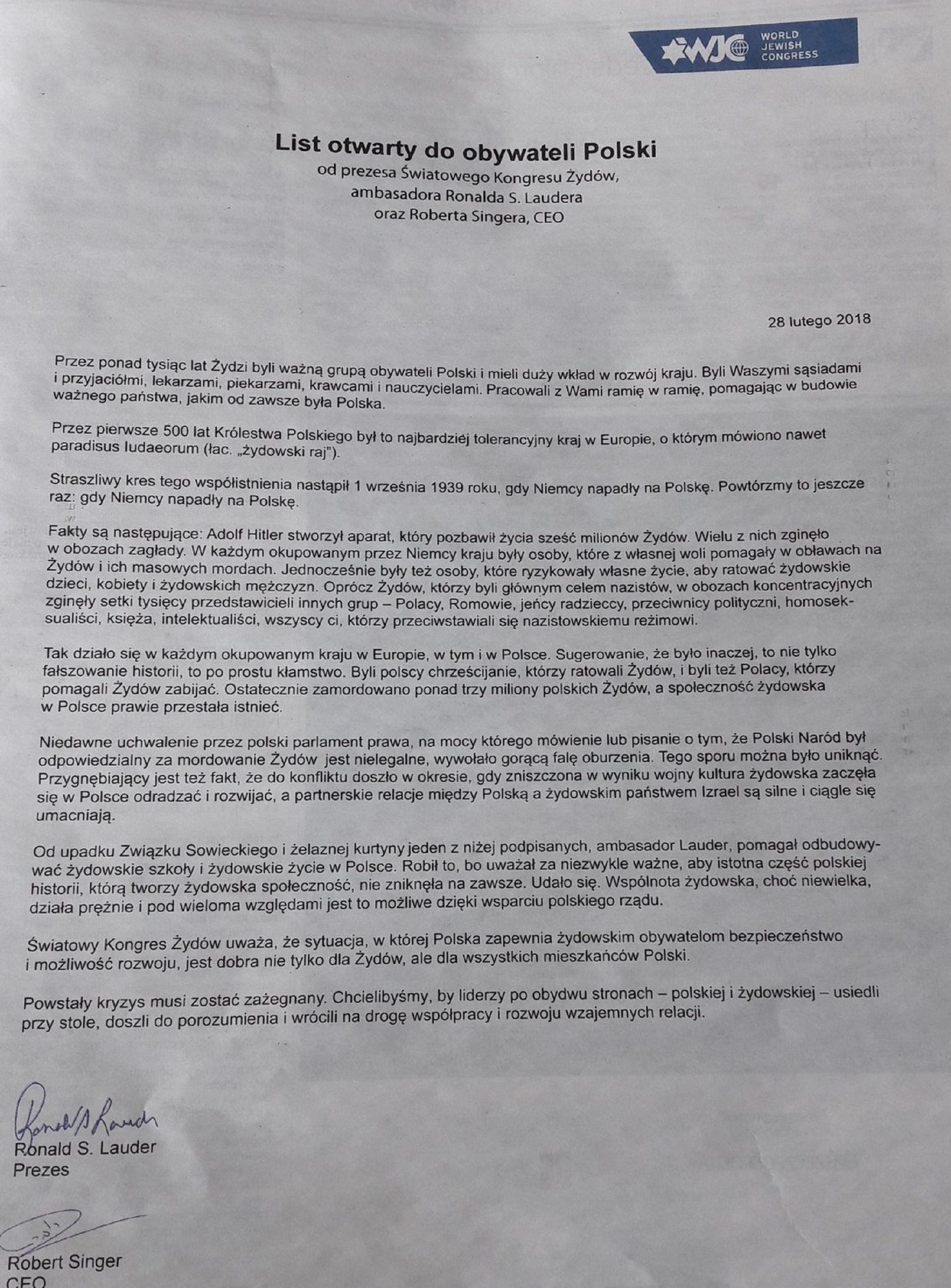 Ronald S. Lauder i Robert Singer objawiają, że to Niemcy napadły na Polskę, a dalej przemilczają rolę żydów w ludobójstwie na Polakach 17 września 1939 i żydowskie sprawstwo wybuchu IIWS w całości. O żydowskich kolaborantach gestapo nie ma tu ani słowa. Cały list ma charakter groźby, wobec ewentualnej polskiej alternatywy do wykładni zawartej w tym piśmidle - bezczelność i arogancja!