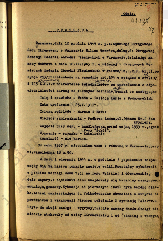 Warszawa, dnia 10 grudnia 1945 r. p.e. Sędziego Okręgowego Sądu Okręgowego w Warszawie Halina Wereike, deleg.do Okręgowej Komisji Badania Zbrodni Niemieckich w Warszawie, działając na mocy dekretu z dnia 10.XI.1945 r, o Głównej i Okręgowych, komisjach Badania Zbrodni Niemieckich w Polsce/Dz.U.R.P. Nr.51, pozycja 293/przesłuchała na zasadzie art. 254 w związku z art.109.107 i 115 K.P.K.w niżej wymienią charakterze świadka pod przysięgą po uprzedzeniu o odpowiedzialności karnej za fałszywe zeznanie świadek zeznał co następuje: