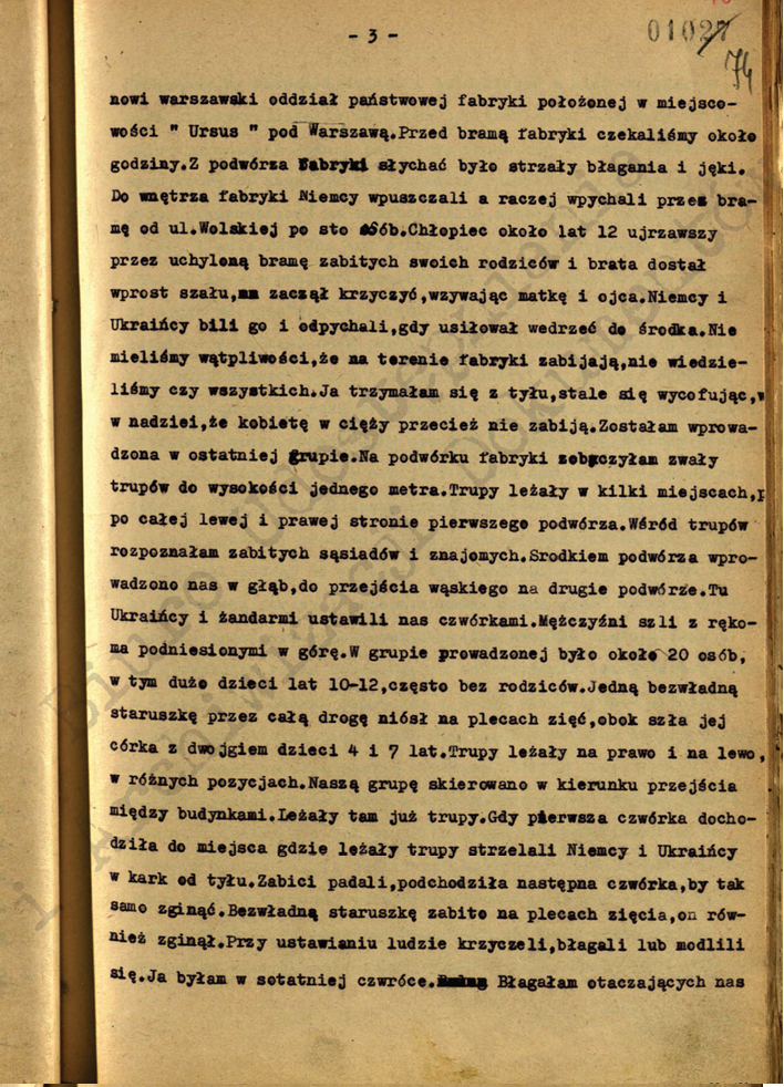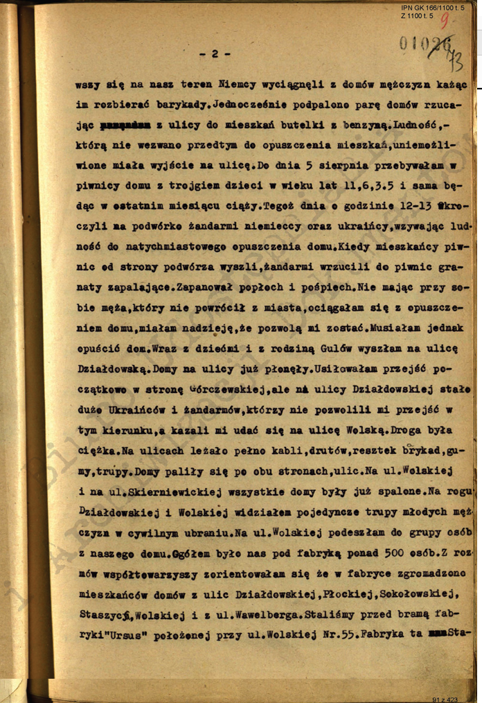 W dniu 1 sierpnia 1944 r. o godzinie 3 popołudniu rozpoczęły się na naszym punkcie zacięte walki. Powstańcy wybudowali w pobliżu naszego domu t.j. na rogu Wolskiej i Górczewskiej dwie zapory. W sąsiednim domu znajdowały się karabiny maszynowo, amunicja, granaty. Sytuacja od pierwszych chwil była bardzo ciężka. Liczni zamieszkujący tu Volksdeutsche strzelali z ukrycia do powstańców i wskazywali Niemcem położenie i sytuację Polaków. Użyte do akcji czołgi - tygrysy, rozbito szereg domów. Czołgi niemieckie atakowały od ulicy Górczewskiej i od Wolskiej i wtargnąwszy na nasz teren Niemcy wyciągnęli z domów mężczyzn każąc im rozbierać barykady. Jednocześnie podpalono parę domów rzucając z ulicy do mieszkań butelki z benzyną. Ludność, - którą nie wezwano przedtym de opuszczenia mieszkań, uniemożliwione miała wyjście ma ulicę. Do dnia 5 sierpnia przebywałam w piwnicy domu z trojgiem dzieci w wieku lat 11,6,3.5 i sama będąc w ostatnim miesiącu ciąży. Tegoż dnia o godzinie 12-13 Wkroczyli ma podwórka żandarmi niemieccy oraz Ukraińcy, wzywając ludność do natychmiastowego opuszczenia domu. Kiedy mieszkańcy piwnic ed strony podwórza wyszli, żandarmi wrzucili do piwnic granaty zapalające. Zapanował popłoch i pośpiech. Nie mając przy sobie męża, który nie powrócił z miasta, ociągałam się z opuszczeniem domu, miałam nadzieję, że pozwolą mi zostać. Musiałam jednak opuścić dom. Wraz z dziećmi i z rodziną Gulów wyszłam na ulicę Działdowską. Domy na ulicy już płonęły. Usiłowałam przejść początkowo w stronę Górczewskiej, ale na ulicy Działdowskiej stało dużo Ukraińców i żandarmów, którzy nie pozwolili mi przejść w tym kierunku, a kazali mi udać się na ulicę Wolską. Droga była ciężka. Na ulicach leżało pełno kabli, drutów, resztek barykad, gumy, trupy. Domy paliły się po obu stronach, ulic. Na ul. Wolskiej i Skierniewickiej wszystkie domy były już spalone. Narogu Działdowskiej i Wolskiej widziałam pojedyncze trupy młodych mężczyzn w cywilnym ubraniu. Na ul. Wolskiej podeszłam do grupy osób z naszego domu. Ogółem było nas pod fabryka ponad 500 osób. Z rozmów współtowarzyszy zorientowałam się że w fabryce zgromadzono mieszkańców domów ulic Działdowskiej, Płockiej, Sokołowskiej, Staszyca, Wolskiej i z ul. Wawelberga. Staliśmy przed bramą fabryki „Ursus” położonej przy ul. Wolskiej Nr.55. Fabryka ta stanowi warszawski oddział państwowej fabryki położonej w miejscowości „Ursus" pod Warszawą. Przed bramą fabryki czekaliśmy około godziny. Z podwórza fabryki słychać było strzały błagania i jęki.
