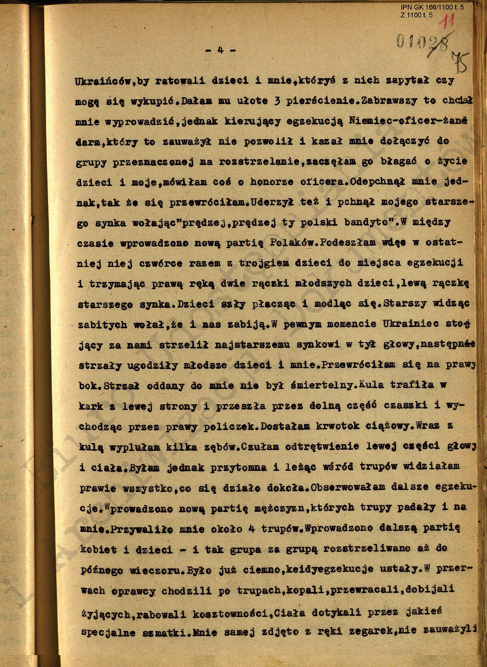 Do wnętrza fabryki Niemcy wpuszczali a raczej wpychali przez bramę od ul.Wolskiej po sto osób. Chłopiec około lat 12 ujrzawszy przez uchyloną bramę zabitych swoich rodziców i brata dostał wprost szału, zaczął krzyczeć, wzywając matkę i ojca. Niemcy i Ukraińcy bili go i odpychali, gdy usiłował wedrzeć do środka. Nie mieliśmy wątpliwości, że na terenie fabryki zabijają, nie wiedzieliśmy czy wszystkich. Ja trzymałam się z tyłu, stale się wycofując, w nadziei, że kobietę w ciąży przecież nie zabiją. Zostałam wprowadzona w ostatniej grupie. Na podwórku fabryki zobaczyłam zwały trupów do wysokości jednego metra. Trupy leżały w kilku miejscach, po całej lewej i prawej stronie pierwszego podwórza. Wśród trupów rozpoznałam zabitych sąsiadów i znajomych. Środkiem podwórza wprowadzono nas w głąb, do przejścia wąskiego na drugie podwórze. Tu Ukraińcy i żandarmi ustawili nas czwórkami. Mężczyźni szli z rękoma podniesionymi w górę. W grupie prowadzonej było około 20 osób, w tym duże dzieci lat 10-12, często bez rodziców. Jedną bezwładną staruszkę przez całą drogę niósł na plecach zięć, obok szła jej córka z dwojgiem dzieci 4 17 lat. Trupy leżały na prawo i na lewo, w różnych pozycjach. Naszą grupę skierowano w kierunku przejścia między budynkami. Leżały tam już trupy. Gdy pierwsza czwórka dochodziła do miejsca gdzie leżały trupy strzelali Niemcy i Ukraińcy w kark od tylu. Zabici padali, podchodziła następna czwórka, by tak samo zginąć. Bezwładna staruszkę zabito na plecach zięcia, on również zginął. Przy ustawianiu ludzie krzyczeli, błagali lub modlili się. Ja była w ostatniej czwórce. Błagałam otaczających nas Ukraińców, by ratowali dzieci i mnie, któryś z nich zapytał czy mogę się wykupić. Dałam mu uote 3 pierścienie. Zabrawszy to chciał mnie wyprowadzić, jednak kierujący egzekucją Niemiec-oficer-żanddarm,który to zauważył nie pozwolił i kazał umie dołączyć do grupy przeznaczonej na rozstrzelanie, zaczęłam go błagać o życie dzieci i moje,mówiłam coś o honorze oficera.Odepchnął mnie jednak,tak że się przewróciłam. Uderzył też i pchnął mojego starszego synka wołając "prędzej,prędzej ty polski bandyto". W między czasie wprowadzono nową partię Polaków. Podeszłam więc w ostatniej niej czwórce razem z trojgiem dzieci do miejsca egzekucji i trzymając prawą ręką dwie rączki młodszych dzieci, lewą rączkę starszego synka. Dzieci szły płacząc i modląc się.Starszy widząc zabitych wołał,że i nas zabiją.W pewnym momencie Ukrainiec stojący za nami strzelił najstarszemu synkowi w tył głowy,następnie strzały ugodziły młodsze dzieci 1 mnie.Przewróciłam się na prawy bok. Strzał oddany do mnie nie był śmiertelny. Kula trafiła w kark z lewej strony i przeszła przez dolną część czaszki i wychodząc przez prawy policzek. Dostałam krwotok ciążowy. Wraz z kulą wyplułam kilka zębów. Czułam odrętwienie lewej części głowy i ciała. Byłam jednak przytomna i leżąc wśród trupów widziałam prawie wszystko, co się działo dokoła. Obserwowałam dalsze egzekucje. Wprowadzono nową partię mężczyzn, których trupy padały i na mnie. Przywaliło mnie około 4 trupów. Wprowadzono dalszą partię kobiet i dzieci - i tak grupa za grupą rozstrzeliwano aż do późnego wieczoru. Było już ciemno, kiedyegzekucje ustały. W przerwach oprawcy chodzili po trupach,kopali,przewracali,dobijali żyjących, rabowali kosztowności. Ciała dotykali przez jakieś specjalne szmatki. Mnie samej zdjęto z ręki zegarek,nie zauważyli przytym, że jeszcze żyję. W czasie tych okropnych czynności pili wódkę, śpiewali wesołe piosenki śmieli się. Obok mie leżał jakiś tęgi, wysoki mężczyzna w skórzanej kurtce, który długo rzęził. Niemcy oddali 5 strzałów zanim skonał. W czasie dobijania strzały raniły mi nogę. Leżałam tak przez długi czas w kałuży krwi, przyciśnięta trupami. Myślała, tylko o śmierci, jak długo będę się jeszcze męczyć. W nocy zepchnęłam martwe ciała leżące na mnie.