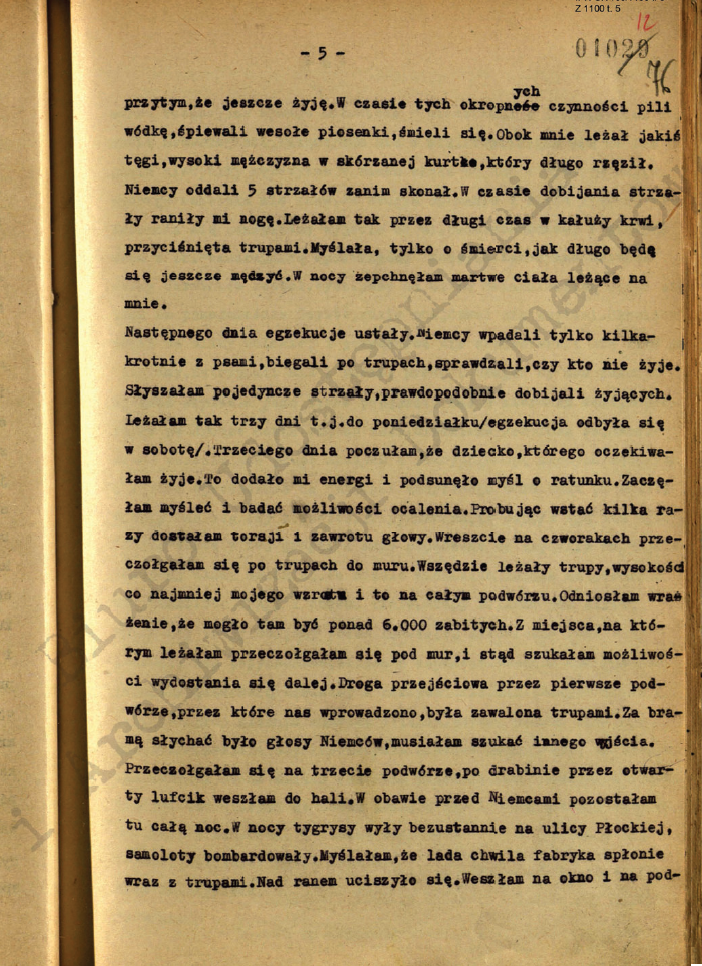 Następnego dala egzekucje ustały. Niemcy wpadali tylko kilkakrotnie z psami, biegali po trupach, sprawdzali, czy kto nie żyje. Słyszałam pojedyncze strzały,prawdopodobnie dobijali żyjących. Leżałam tak trzy dni t.j. do poniedziałku/egzekucja odbyła się w sobotę/. Trzeciego dnia poczułam, że dziecko, którego oczekiwałam żyje. To dodało mi energi i podsunęło myśl o ratunku. Zaczęłam myśleć i badać możliwości ocalenia. Próbując wstać kilka razy dostałam torsji i zawrotu głowy. Wreszcie na czworakach przeczołgałam się po trupach do muru. Wszędzie leżały trupy, wysokości co najmniej mojego wzrostu i to na całym podwórzu. Odniosłam wrażenie, że mogło tam być ponad 6.000 zabitych. Z miejsca, na którym leżałam przeczołgałam się pod mur, i stąd szukałam możliwości wydostania się dalej. Droga przejściowa przez pierwsze podwórze, przez która nas prowadzono, była zawalona trupami. Za brama słychać było glosy Niemców, musiałam szukać innego wyjścia. Przeczołgałam się na trzecie podwórze, po drabinie przez otwarty lufcik weszłam do hali. W obawie przed Niemcami pozostałam tu całą noc.W nocy tygrysy wyły bezustannie na ulicy Płockiej, samoloty bombardowały. Myślałam, że lada chwila fabryka spłonie wraz z trupami. Nad ranem uciszyło się. Weszłam na okno i na podwórzu zobaczyłam żywego człowieka - mieszkankę naszego domu ob. Zofię Staworzyńską. Połączyłam się z nią. Przyczołgał się do nas jakiś niedobity mężczyzna w wieku około 60 lat z wybitym okiem, którego nazwiska nie znam. Po długim szukaniu i wielu probach wydostania się odkryliśmy wyjście od ul. Skiernieickiej i tamtędy wraz z ob. Staworzynską opuściliśmy fabrykę. Mężczyzna słyszący głosy Ukraińców został. Wyszliśmy na Skierniewicką, chcąc dostać się na przedmieście Czyste, gdzie znajdował się szpital. Ukraińcy stali na ulicy Wolskiej i początkowo nie zorientowali się skąd idziemy. Zatrzymali nas i pomimo próśb i błagań by nas puścili do szpitala jako ranne popędzili nas w kierunku Woli, zabierając po drodze coraz więcej osób. Niedaleka kościoła św. Stanisława rozdzielone grupę młodych i starych. Grupę młodych mężczyzn i kobiet wprowadzono do jakiegoś zburzonego domu skąd pe chwili doszły nas odgłosy strzałów. Przypuszczam, iż odbyła się tam egzekucja. Resztę w tej grupie i mnie popędzono do szpitala św. Wojciecha przy ulicy Wolskiej. Po drodze widziałam leżące na jezdni i na chodnikach trupy i części ciała. Grupy Polaków pod strażą uprzątały trupy. Stojący przed kościołem oficerowie niemieccy przyjęli nas popychaniem, biciem i kopaniem. Kościół był zapełniony ludnością Warszawy z różnych dzielnic. Leżałam tam przez parę dni przy głównym ołtarzu. Żadnej pomocy mnie nie udzielono. Jedynie współtowarzysze niedoli podali mnie tylko trochę wody. Po dwóch dniach zostałam przewieziona furmanka z ciężko rannymi lub chorymi do obozu przejściowego w Pruszkowie, skąd do szpitali w Komorowie i Leśnej Podkowie, Obecnie nie czuje się zdrowa. Jakkolwiek musze pracować by wychować dziecko po strasznych przeżyciach.