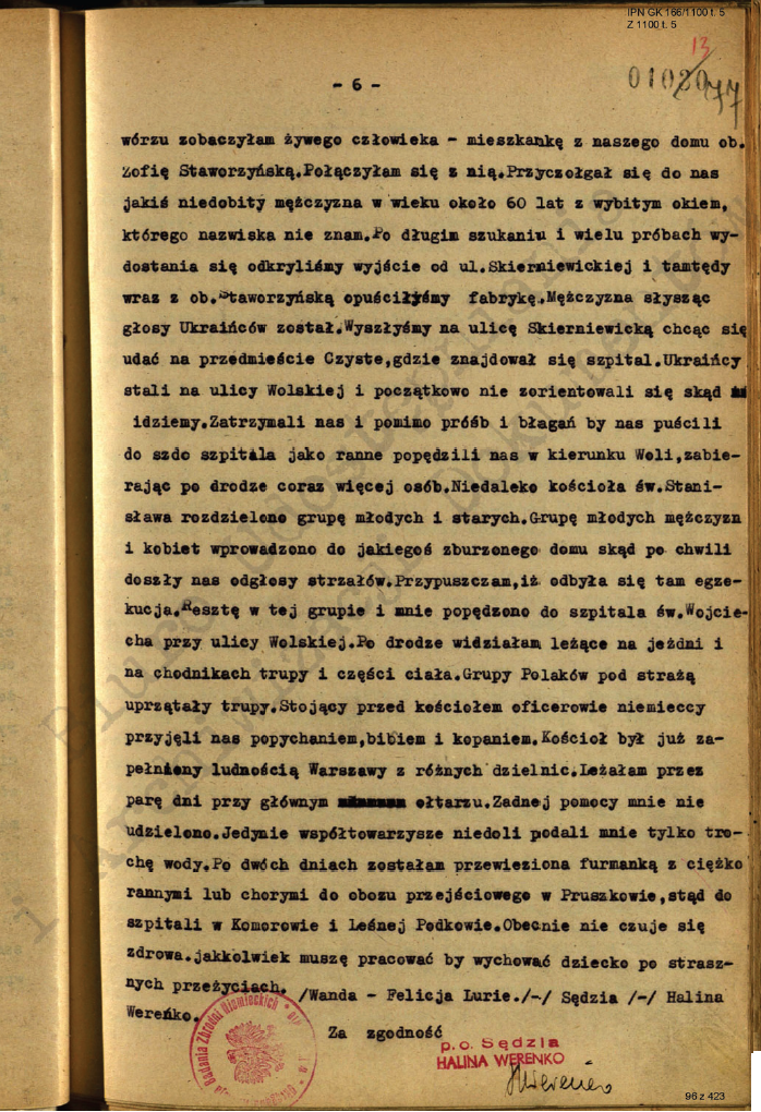 Warszawa, dnia 20 listopada 1946 r. pełniąca obowiązki Sędziego Śledczego Sądu Okręgowego w Warszawie Halina Werenko działając na mocy Dekretu z dnia 10.XI.1945 r. o Głównej i Okręgowych Komisjach Badania Zbrodni Niemieckich w Polsce / Dz.U.R.P.Nr.51,poz.293 / dokonała za pośrednictwem biegłego sądowego profesora Uniwersytetu i. Warszawskiego Wiktora Grzywo-Dąbrowskiego oględzin sądowo-lekarskich poszkodowanej Wandy Felicji Lurie z Podwysockich, która wylegitymowała się tymczasowym zaświadczeniem Zarządu Gminnego w Helenowie wystawionym w dniu 16 lutego 1945 r.