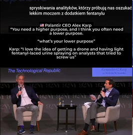 Udostępnia odświeżony klip z kwietnia 2025 roku z Hill & Valley Forum, na którym CEO Palantir Alex Karp, skonfrontowany przez protestującego w sprawie narzędzi AI firmy, które rzekomo pomagają Izraelowi w celowaniu w Gazie, odpowiada, że ofiary to „w większości terroryści”, a Hamas to „pożyteczni idioci”. Wywołało to nową falę oburzenia w kontekście ponad 43 000 zgłoszonych palestyńskich ofiar śmiertelnych od października 2023 według danych ONZ.Kontekst i fakty: Platforma Gotham firmy Palantir jest używana przez IDF od 2017 roku, a jej wykorzystanie znacznie wzrosło po 2023. Służy do integracji danych i predykcyjnego wskazywania celów przy użyciu AI. Grupy praw człowieka (m.in. Amnesty International) krytykują ją za umożliwianie nieproporcjonalnych strat cywilnych przy niewystarczającym nadzorze – patrz śledztwo +972 Magazine z 2024 roku.Dlaczego klip znowu stał się viralowy w lutym 2026: Post zebrał ponad 19 tys. polubień w krótkim czasie. Pokazuje trwającą debatę o roli firm technologicznych w konfliktach zbrojnych – podobne zarzuty padają wobec Google (Project Nimbus) i innych, co opisuje raport Business & Human Rights Resource Centre z 2025 roku.