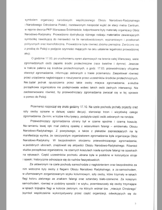 Uczestnicy zgromadzenia stanowiący czoło pochodu, sposobem ubioru, przemarszu, sposobem trzymania flag i ich symboliką noszonymi emblematami, oraz skandowanymi hasłami w sposób celowy i świadomy odwoływali się do włoskich organizacji faszystowskich (tzw. Czarne Koszule) i niemieckich nazistowskich (NSDAP), oraz polskich faszyzujących organizacji przedwojennych (Obóz Wielkiej Polski. Obóz Narodowo-Radykalny). w ten sposób publicznie propagując totalitarne ustroje państwa, które te organizacje (w przypadku ruchów włoskich i niemieckich) stworzyły. Jednocześnie cytowane powyżej skandowane przez uczestników zgromadzenia hasła wzywały do nienawiści na tle różnic narodowościowych i etnicznych.