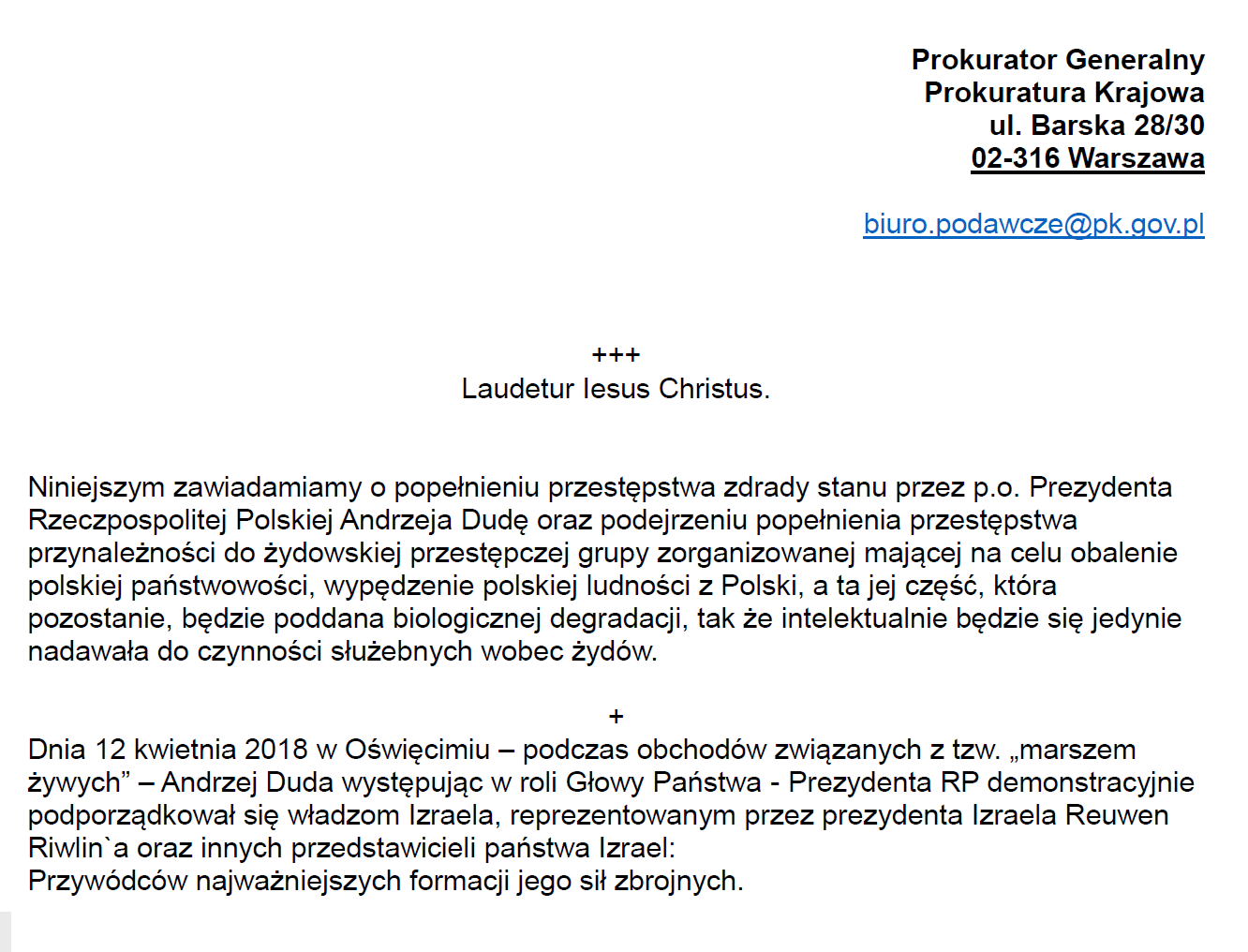 Zawiadomienie do prokuratury: A. Duda - zdrada stanu ...(+Pugna+)... - w barwach „Izraela”, a Żydaera faktycznie, bo to jest właściwa nazwa dla tej społeczności ludobójców. Co więcej, Andrzej Duda oprowadził symbolicznie zebranych sześciu głównych przedstawicieli państwa ...Created on 18 April 2018