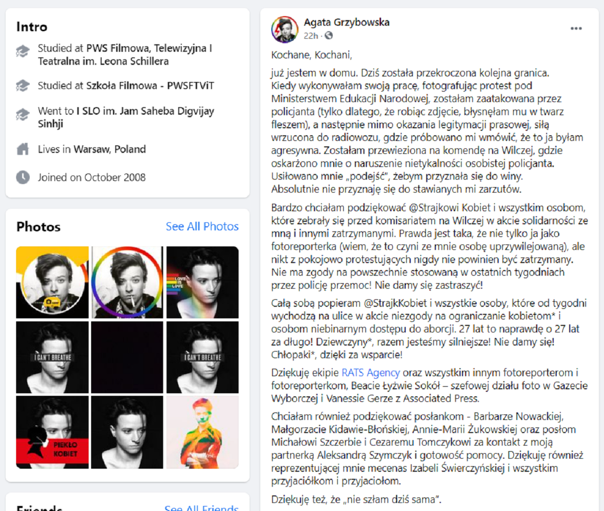 Bardzo chciałam podziękować @Strajkowi Kobiet i wszystkim osobom, które zebrały się przed komisariatem na Wilczej w akcie solidarności ze mną i innymi zatrzymanymi. Prawda jest taka, że nie tylko ja jako fotoreporterka (wiem, że to czyni ze mnie osobę uprzywilejowaną), ale nikt z pokojowo protestujących nigdy nie powinien być zatrzymany. Nie ma zgody na powszechnie stosowaną w ostatnich tygodniach przez policję przemoc! Nie damy się zastraszyć!