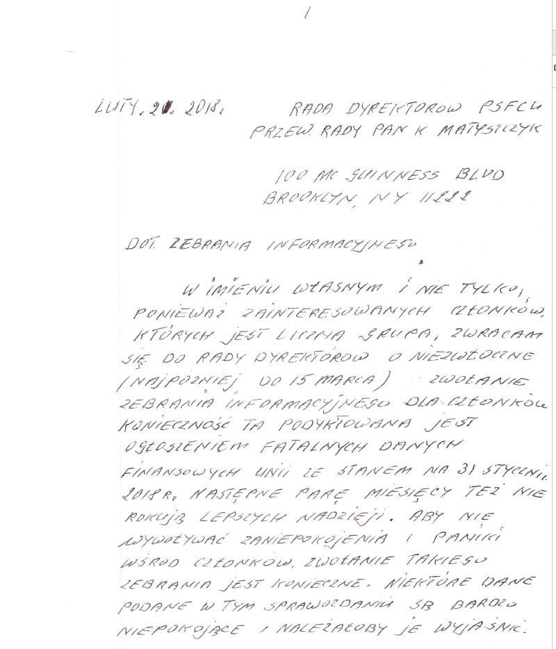 Jan W.  w tej chwili jest w drodze na Manhattan do adwokata Glassa, żeby sądownie zablokować "niespodziankę" tj. decyzję Uunii o zebraniu specjalnym i prosił abym taką informację przekazał i rozesłał  do czlonkow Polsko-Slowianskiej Federalnej Unii Kredytowej w Nowym Jorku.
