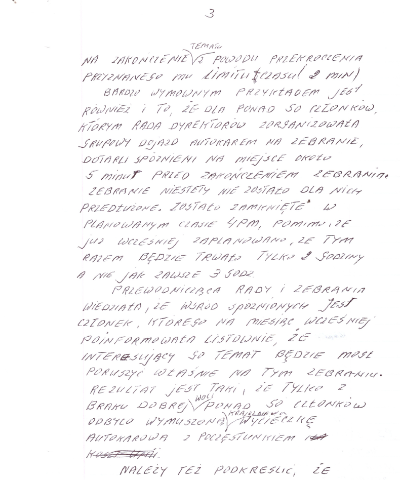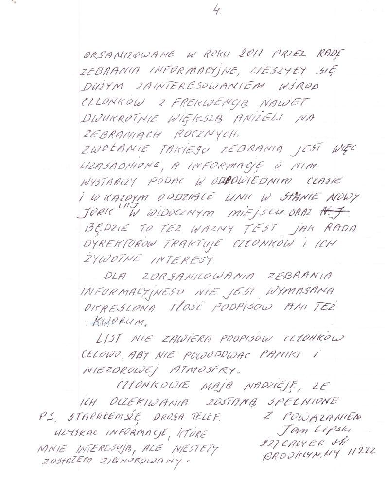 3. Poddania pod głosowanie wniosku o usunięcie Leona Kokoszki z Rady Dyrektorów i członkostwa w P&SFCU za złamanie obietnic wyborczych i świadome wprowadzanie w błąd członków, którzy głosowali za nim. Po tym, jak został wybrany do Zarządu, Leon Kokoszka, w obecności różnych Członków, nazwał postulaty, na mocy których został wybrany "kiełbasą wyborczą" i stwierdził, że nie będzie można ich zrealizować.*