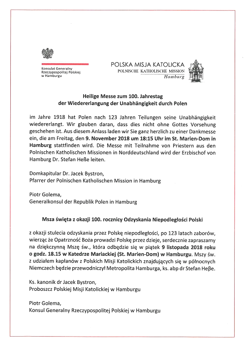 Wśród wielu uroczystości z okazji Roku 100-lecia Polskiej Niepodległości w Hamburgu, wielu imprez i koncertów w dniu 9 listopada 2019 roku ogodz.18.15 w Katedrze Mariackiej /St Marien - Dom/ odbędzie się dziękczynna Msza św. z udziałem kapłanów z Polskich Misji Katolickich znajdujących się w północnych Niemczech w której będzie przewodniczył Metropolita Hamburga ks. abp dr. Stefan Heße. Mszy towarzyszą sztandary misyjne i kombatanckie......(....)
