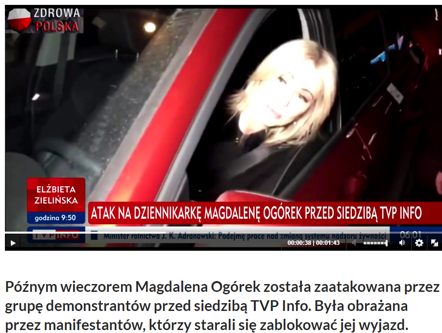 Późnym wieczorem Magdalena Ogórek została zaatakowana przez przed siedzibą TVP Info przez bojówkarzy totalnej opozycji. Była obrażana przez manifestantów, którzy starali się zablokować jej wyjazd. Protestujący krzyczeli do niej m.in. „Wstyd i hańba”, „Kłamczucha”. Kartki z podobnymi napisami nakleili też na auto. „Proszę przyjąć moje wyrazy ubolewania za brak stanowczej reakcji policji wobec tej dziczy, która zaatakowała Panią przed budynkiem TVP Info – napisał na Twitterze w nocy z soboty na niedzielę do dziennikarki szef MSWiA Joachim Brudziński. Poleciłem analizę materiałów operacyjnych – dodał.