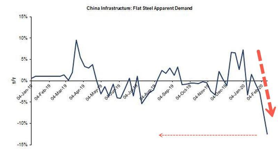 Proszę spojrzeć na wykres poniżej. Pokazuje on, że w ubiegłym tygodniu, od 7 do 13 lutego, popyt na stal spadł aż o 40%: