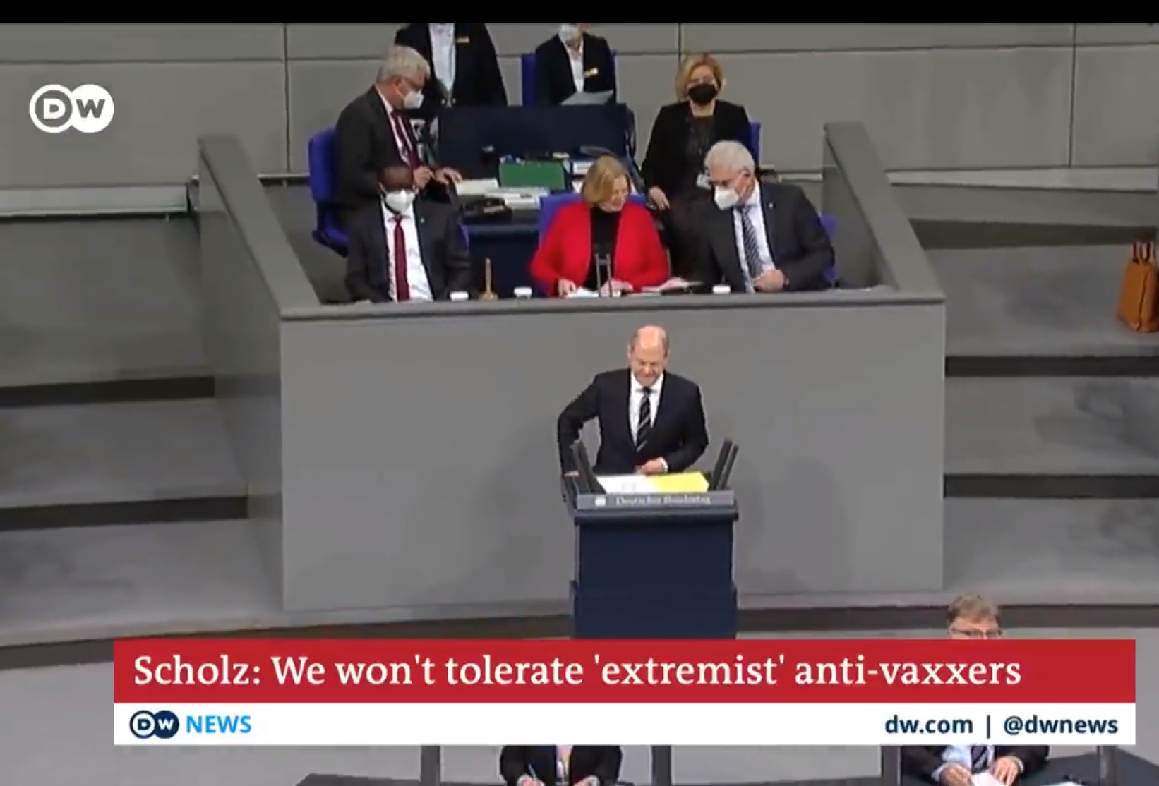 Early on his address, Scholz focused on the coronavirus pandemic, calling on German citizens to get vaccinated and help return life to normal."It's very important that we continue to work together, join hands and defeat the coronavirus," he said. He said the new German government would work intensively to bring vaccines to poor countries.He heavily criticized the extremist opponents of coronavirus measures, referring to conspiracy theorists, misinformation spreaders, and extremists. "We are not going to tolerate that a small number of extremists tries to impose their will on our entire society," he said, explicitly referring to the recent torchlit march in Saxony. "Our democracy is ready to defend itself, and knows how to do it."