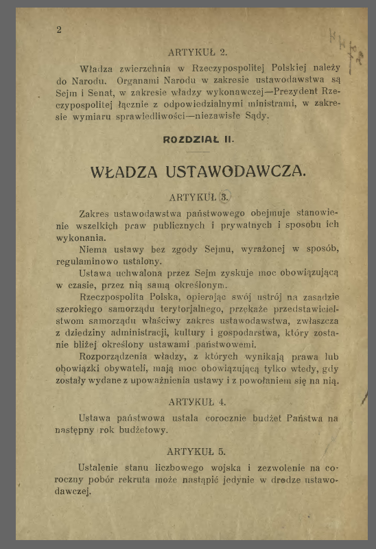 Władza zwierzchnia w Rzeczypospolitej Polskiej należy do Narodu. Organami Narodu w zakresie ustawodawstwa są Sejm i Senat, w zakresie władzy wykonawczej —- Prezydent Rzeczypospolitej łącznie z odpowiedzialnymi ministrami, w zakresie wymiaru sprawiedliwości — niezawisłe Sądy.