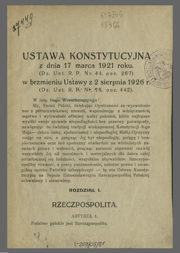 My, Naród Polski, dziękując Opatrzności za wyzwolenie nas z półtorawiekowej niewoli, wspominając z wdzięcznością męstwo i wytrwałość ofiarnej walki pokoleń, które najlepsze wysiłki swoje sprawie niepodległości bez przerwy poświęcały, nawiązując do świetnej tradycji wiekopomnej Konstytucji 3-go Maja — dobro całej, zjednoczonej i niepodległej Matki-Ojczyzny mając na oku, a pragnąc Jej byt niepodległy, potęgę i bezpieczeństwo oraz ład społeczny utwierdzić na wiekuistych zasadach prawa i wolności, pragnąc zarazem zapewnić rozwój wszystkich Jej sił moralnych i materjalnych dla dobra całej odradzającej się ludzkości, wszystkim obywatelom Rzeczypospolitej równość, a pracy poszanowanie, należne prawa i szczególną opiekę Państwa zabezpieczyć tę oto Ustawę Konstytucyjną na Sejmie Ustawodawczym Rzeczypospolitej Polskiej uchwalamy i stanowimy.