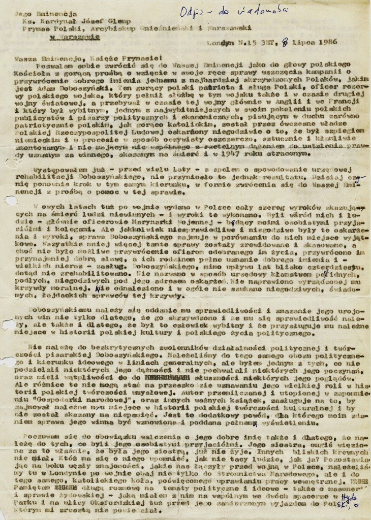 Jędrzej Giertych, list do Prymasa Józefa Glempa z prośbą o wszczęcie kampanii w sprawie rehabilitacji zamordowanego przez żydów Adama Doboszyńskiego.