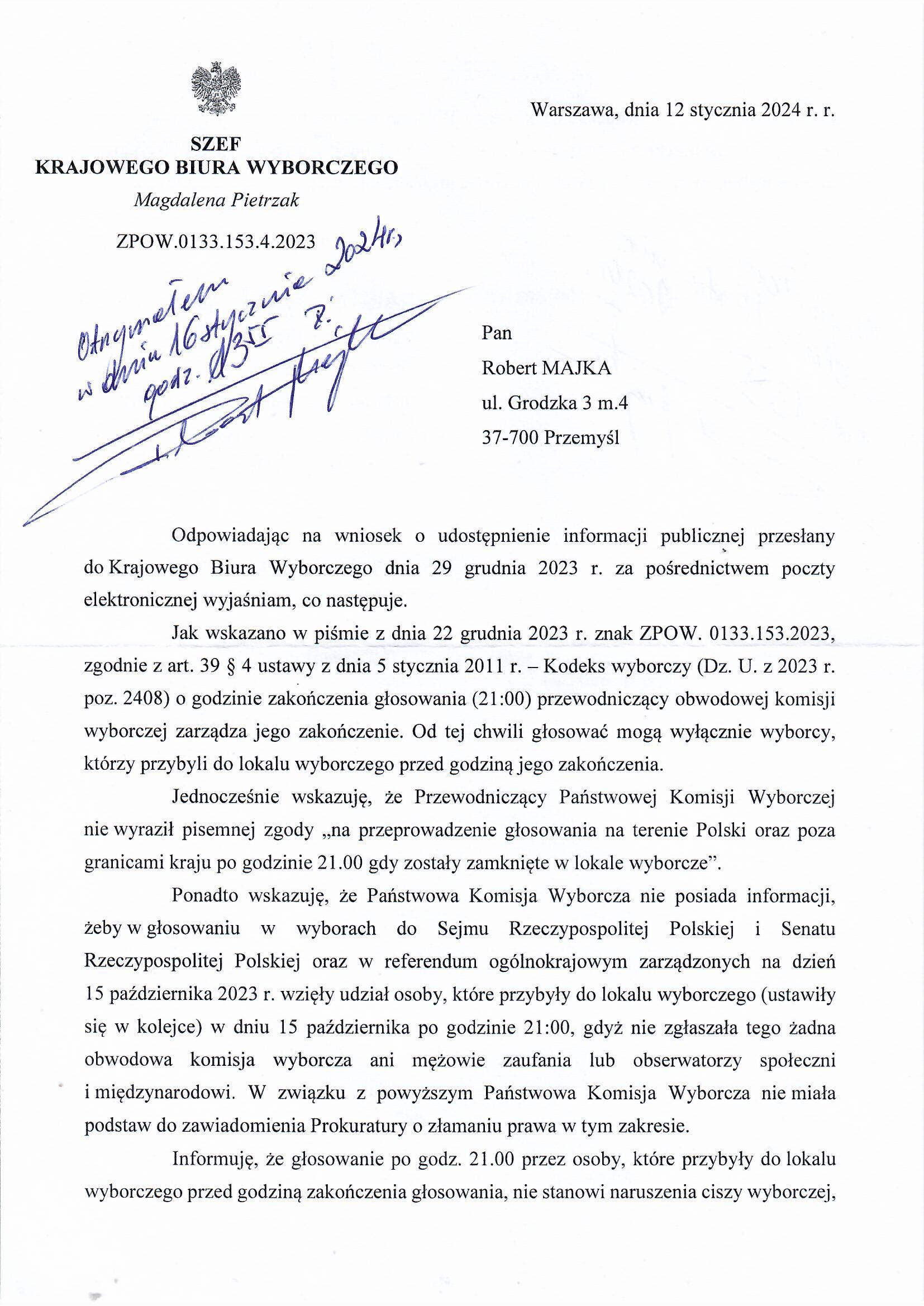 Ponadto wskazuję, że Państwowa Komisja Wyborcza nie posiada informacji, żeby w głosowaniu w wyborach do Sejmu Rzeczypospolitej Polskiej i Senatu Rzeczypospolitej Polskiej oraz w referendum ogólnokrajowym zarządzonych na dzień 15 października 2023 r. wzięły udział osoby, które przybyły do lokalu wyborczego (ustawiły się w kolejce) w dniu 15 października po godzinie 21:00, gdyż nie zgłaszała tego żadna obwodowa komisja wyborcza ani mężowie zaufania lub obserwatorzy społeczni i międzynarodowi. W związku z powyższym Państwowa Komisja Wyborcza nie miała podstaw do zawiadomienia Prokuratury o złamaniu prawa w tym zakresie.