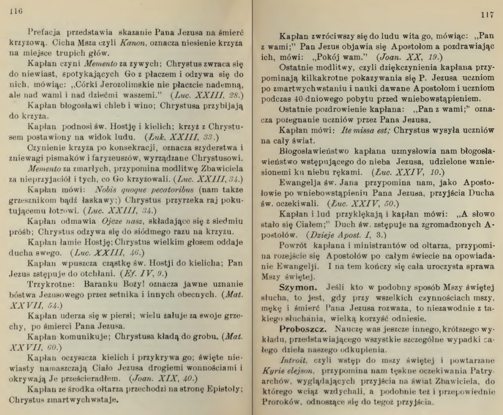 Szymon. Mam w książce swojej do nabożeństwa wykład Mszy św, w którym pojedynczym czynnościom kapłana od początku do końca Mszy św. nadane jest znaczenie kolejnych części męki Pana naszego Jezusa Chrystusa.