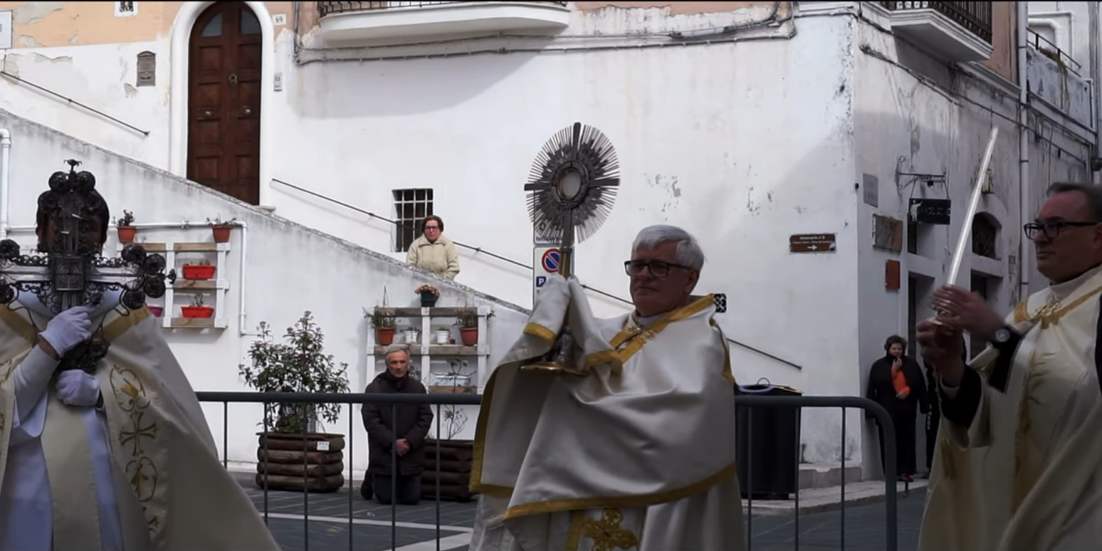 Eccezionale perché la potenza delle immagini, un raggio di sole fisso sui religiosi, il silenzio circostante interrotto solo dal vento e dal rintocco delle campane della torre angioina, hanno dato “voce” al Santissimo Sacramento e ai simboli della crocefissione e del Principe Celeste, portati solennemente all’esterno della Basilica, ai quali ognuno ha potuto rivolgere la propria supplica.