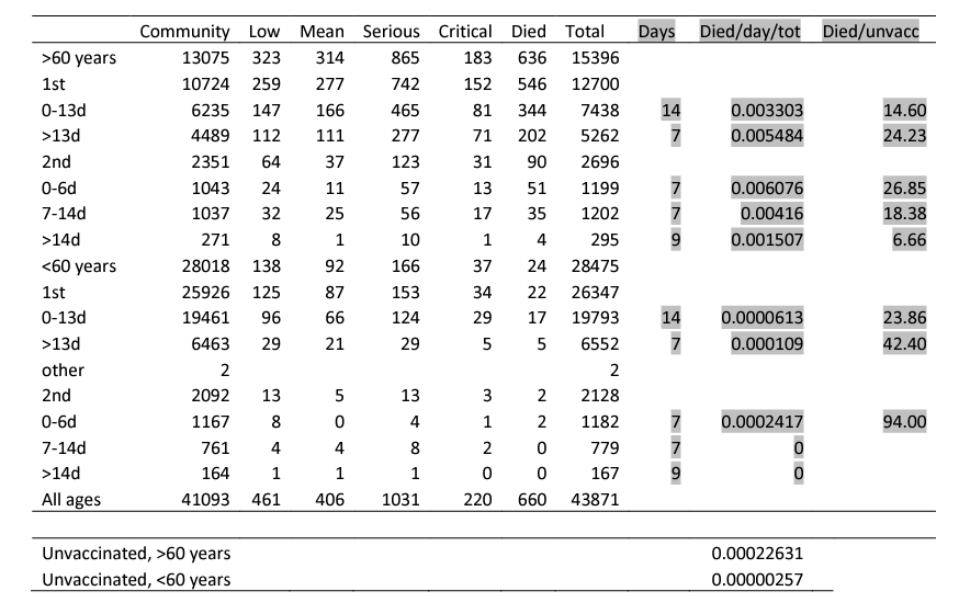 Przedstawiamy tutaj szczegółowo analizy kosztów dotyczące zgonów spowodowanych przez szczepienia COVID19 zgodnie z tabelą 1. W przypadku osób powyżej 60. roku życia w ciągu pierwszych 14 dni po podaniu pierwszej dawki zgony są 14,6 razy częstsze dziennie niż w przypadku osób niezaszczepionych.Oznacza to, że aby zrekompensować te nadmierne zgony, 14,6 x 14 dni = 204,4 dni bezwzględnej ochrony przed COVID19 jest konieczne, aby uzyskać korzyści netto w wysokości 0 dla tego pierwszego okresu po wstrzyknięciu pierwszej dawki. Podobne obliczenia pokazują, że przez trzeci tydzień po pierwszym wstrzyknięciu wyrównanie zwiększonej liczby zgonów w porównaniu z osobami niezaszczepionymi wymagałoby dodatkowych 24,23x7 dni = 169,61 dni pełnej ochrony szczepionki przed COVID19. Pierwszy tydzień po drugiej iniekcji wymaga 26,85x7 dni = 187,95 dni pełnej ochrony szczepionki przeciwko COVID19 w celu zrekompensowania nadmiernej liczby zgonów spowodowanych COVID19 w tym okresie. Drugi tydzień po wstrzyknięciu drugiej dawki wymaga 18,38x7 dni = 128,66 dni pełnej ochrony szczepionki. W sumie rekompensata, aby osiągnąć 0 kosztów i korzyści, wymaga 690. 62 pełna ochrona szczepionkowa przed COVID19 dla osób starszych. Należy pamiętać, że nie obejmuje to zgonów wywołanych przez szczepienia niezwiązanych z COVID19, a ochrona szczepionkowa nie jest absolutna.