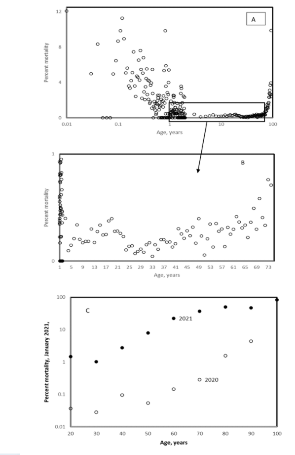 Punkt ten można odnieść również do osób bardzo młodych, co pokazuje szczegółowa analiza śmiertelności jako funkcja wieku po zebraniu danych VAERS ze wszystkich szczepionek w latach 1990–2020, ryc. 1A. Śmiertelność z powodu niekorzystnych skutków szczepionek jest większa u osób bardzo młodych niż u osób starszych, nawet w przypadku tradycyjnych szczepionek.