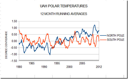 RYS.2. 12 MIESIĘCZNE BIEŻĄCE ŚREDNIE TEMPERATURY DLA PÓŁNOCNEGO I POŁUDNIOWEGO BIEGUNA WEDŁUG UNIWERSYTETU ALABAMA W HUNTSVILLE 1980-2012