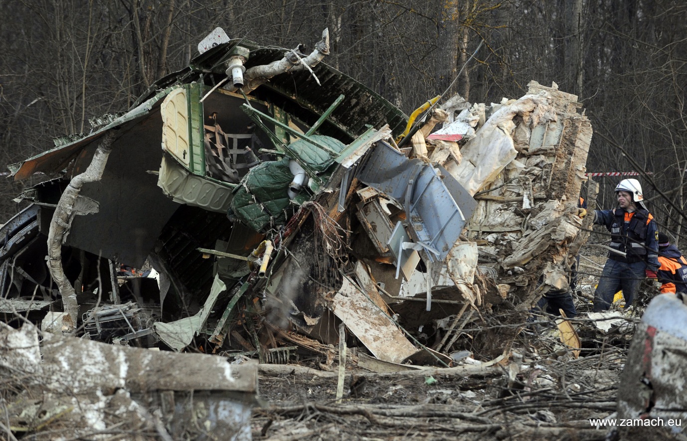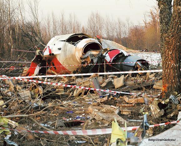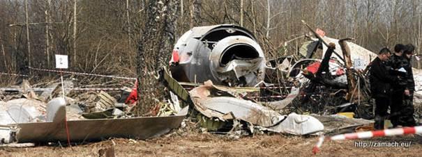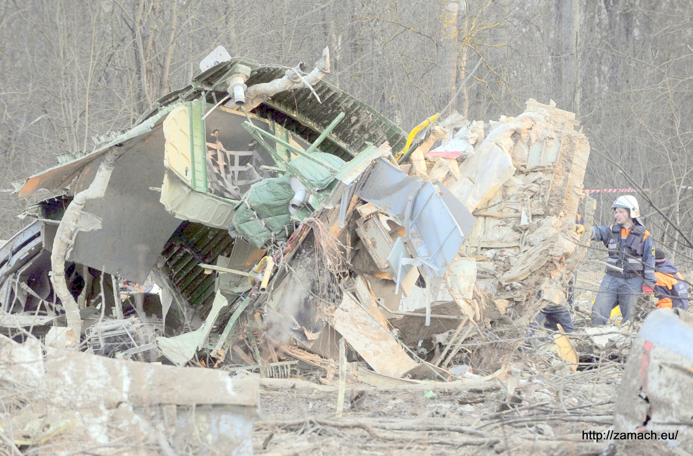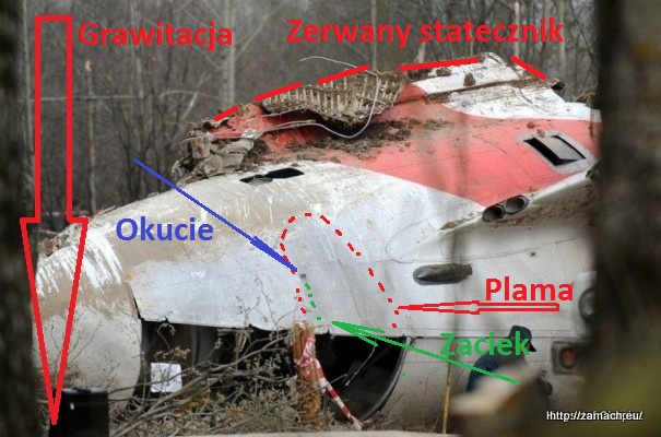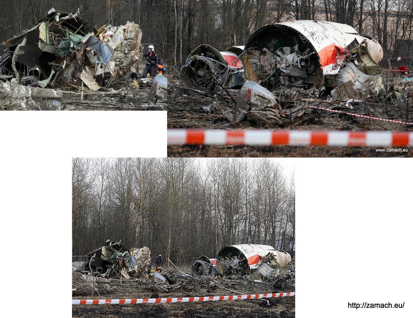 http://zamach.eu/100821%20Oszustwo%20katastrofy%20smolenskiej/Oszustwo.htm (szczegółowo omówione) są sprzeczne w sensie prawdopodobieństwa ich wystąpienia lub zaistnienia fizycznie w ogóle. Części wraku nie wykazują śladów przesuwania się po ziemi lub turlania się, co zawsze występuje podczas katastrofy, a jedynie ukazuje ich osadzenie „plackiem”, co sugeruje użycie dźwigu czy helikoptera przy ich podrzucaniu na miejsce inscenizacji. Dodatkowo wrak w części ogonowej wykazuje zacieki, które swym charakterem są sprzeczne z prawem grawitacji, co świadczy dobitnie o tym, że pokazane części wraku nie pochodzą od samolotu , który był zdolny do lotu na ¼ czy ½ doby, a z niemałym prawdopodobieństwem można powiedzieć, że był uszykowany do inscenizacji na już parę dni przed 10 kwietnia 2010 roku, bo widać, że zacieki te powstały i utrwaliły się w pozycji o 180 odwrotnej, a więc nie mogły powstać w trakcie tej katastrofy i w tym miejscu. Skrzydło prawe wykazuje dobitnie fakt zarówno jego sztucznego podrzucenia, jak dużą siłę fali uderzeniowej (od wybuchu naziemnego) skierowanej na skrzydło, która to skrzydło przecięła na pniu stojącego drzewa. Biorąc pod uwagę fakt, że skrzydło to: - Znajdowało się w „niewłaściwym” - sprzecznym z ew. przebiegiem katastrofy miejscu, lub tym bardziej, szczególnie sprzecznym z hipotezą wybuchów w powietrzu. - Znajdowało się daleko od centrum uderzenia i wytraciłoby już energię kinetyczną (wynikającą z normalnego przebiegu rozpadu części samolotu przy katastrofie). Nie jest możliwym doszukiwanie się przyczyn takiego stanu rzeczy (przecięcia tego skrzydła) wskutek katastrofy – jako oderwanego elementu konstrukcji - który tak uderzył w to drzewo, ale dowodzi zastosowania, właśnie w przypadku, tj. ładunku wybuchowego dużej mocy i zdetonowanego na ziemi. http://zamach.eu/120406/Untitled_1.html (szczegółowo omówione) O wystąpienia wybuchu naziemnego świadczą również wspomniane wyżej, nastrzelane kamienie i białe błoto na wewnętrznych częściach kabiny pasażerskiej (część tylna kadłuba) oraz na części kopuły ciśnieniowej (ogona). Ślady są okrągłe i bez zacieków , a co świadczy o tym , że były one „nastrzelone” na kadłub, który znajdował się w spoczynku i to z tak dużą energią, która sprawiła , że woda wchodząca w skład tego błota została odparowana bardzo gwałtownie (bardzo wyraźnie widać to na goleni lub bocznych części opon), a które to zjawisko jest wykluczone przy rozbiciu się samolotu o ziemię. Generalnie należy stwierdzić to, że gdyby wspomniane części wraku pochodziły od innego zdarzenia niż tu opisane, to taki charakter zabrudzeń na częściach wewnętrznych i wklęsłych powierzchni wraku nie byłyby możliwe w ogóle, a fotografie zdjęć innych katastrof podobnych śladów nie pokazują. Na zdjęciach łatwo zauważa się brak wykładzin estetycznych ścian kadłuba (interior), typowych dla Tupolewa oraz wykładzin izolacji dźwiękowej i termicznej (w wystarczającej ilości). Fakt zaś nastrzelania błota bezpośrednio na obnażone blachy konstrukcji wewnętrznej kadłuba świadczyć może łatwo o tym, że skorupy tego kadłuba zostały podrzucone na polanę bez tych pokryć (izolacji i interioru)
