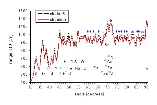 Fig. 10. Various ferrous and non-ferrous (non-magnetic) objects adhering spontaneously to the body of the tested person. BS On the edge of the photo on the left side you can see a polycarbonate plate with a thickness of 10 mm and a brass plate with a thickness of 4 mm. In turn, Figure 11 shows the radiation spectrum of torsion field particles from this person. As the center of the radiation appeared to lie in the vicinity of the heart chakra, the information of the torsion field particles was captured from where the heart chakra is located by putting a bottle of boiled water on it for three minutes. Additionally, a signal was taken from the arm, i.e. where there are no chakras. A strong signal in the bottle was needed so that it would not be disturbed during the transport to the laboratory. Later, the signal was repeatedly attenuated to the requirements of the spectroscope. Fig. 11. Spectrum of the torsion field particle signal taken from the area of the heart chakra and from the arm of a person with the natural ability to attract metal objects. Markings: chakra5 - heart chakra signal, shoulder - shoulder signal, p - protons, e- - electrons, n - neutrons, d - deuterons, α - alpha particles, ν - neutrinos, He + - ionized helium molecule, He - helium, H - hydrogen, D - deuterium, C - carbon, S - sulfur, O - oxygen, Na - sodium, Cl - chlorine, Fe - iron, Cu - copper, Zn - zinc, Se - selenium, w - WIMP- y. e - signal from aromatic amino acid rings. Axis of absences - the angle of the incident beam relative to the breaking plane, measured in degrees; ordinate axis - range of Category K10 radiation from samples at the output of the spectroscope, measured in centimeters.