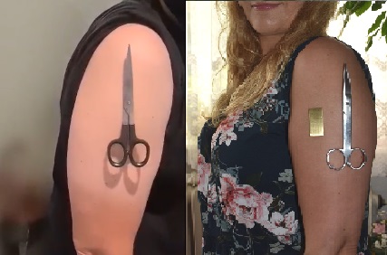 Som vi redan vet från många internetrapporter visar vissa människor som vaccinerats med COVID-19-vaccinet, som en vaccineffekt, det magiska fenomenet att locka metallföremål till armen som vaccinet administrerades till, och i extrema fall till hela kroppen . Denna effekt är förknippad med den tidigare planerade märkningen av vaccinerade personer, så att vaccinationen kan kontrolleras med flygplatsutrustning, oavsett vaccinationsintyg. Nyligen har människor som rest med flyg märkt att terahertz -skannrar för screening av resenärer nyligen har stängts av. Jag undersökte strålningsspektra för torsionsfältpartiklar från armen på två personer som vaccinerats med COVID-19-vaccinet, som visade spontan dragning till metallföremål, men hade ingen sådan förmåga tidigare. På bilden, fig. 13 visar dessa två personer med en sax som dras till armen. Den första personen är en italienare från Sicilien som vaccinerades i sitt land med Moderna -vaccinet. Den andra personen är en polsk kvinna som bor i London, vaccinerad där med Pfizer -vaccinet, som just kom till Polen. I det första fallet togs spektrumet från en filmram gjord speciellt för denna artikel av Jarosław Dobrucki. I det andra fallet insamlades signalen genom att placera en flaska med vatten mot den inokulerade armen i tre minuter. I det första fallet togs spektrumet från en filmram gjord speciellt för denna artikel av Jarosław Dobrucki. I det andra fallet insamlades signalen genom att placera en flaska med vatten mot den inokulerade armen i tre minuter. I det första fallet togs spektrumet från en filmram gjord speciellt för denna artikel av Jarosław Dobrucki. I det andra fallet insamlades signalen genom att placera en flaska med vatten mot den inokulerade armen i tre minuter. Fig. 13. Foton av två personer som vaccinerats med vacciner: Moderna (vänster) och Pfizer (höger), som visar attraktion av metallföremål, den gyllene rektangeln är en 4 mm tjock mässingsplatta och därför icke-magnetisk. På samma sätt fanns det i det första fallet attraktion av icke-magnetiska metaller, t.ex. 10 eurocent mynt, som inte lockades av en magnet.