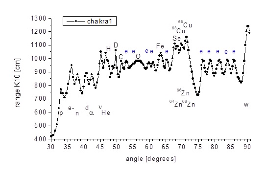 Fig. 10. Olika järnhaltiga och icke-järnhaltiga (icke-magnetiska) föremål som spontant fäster vid den undersökta personens kropp BS På fotokanten till vänster en 10 mm tjock polykarbonatplatta och en 4 mm tjock mässingsplatta är synliga. I sin tur visar figur 11 strålningsspektrumet för torsionsfältpartiklar från denna person. Eftersom strålningens centrum tycktes ligga i närheten av hjärtchakrat, fångades informationen om torsionsfältpartiklarna från där hjärtchakrat är placerat genom att lägga en flaska kokt vatten på det i tre minuter. Dessutom togs en signal från armen, det vill säga där det inte finns några chakran. En stark signal i flaskan behövdes för att den inte skulle bli störd under transporten till laboratoriet. Senare dämpades signalen upprepade gånger till spektroskopets krav. Fig. 11. Spektrum av torsionsfältpartikelsignalen tagen från området i hjärtchakrat och från armen på en person med den naturliga förmågan att attrahera metallföremål. Märkning: chakra5 - hjärtchakrasignal, axel - axelsignal, p - protoner, e- - elektroner, n - neutroner, d - deuteroner, α - alfapartiklar, v - neutrinoer, He + - joniserad heliummolekyl, He - helium, H - väte, D - deuterium, C - kol, S - svavel, O - syre, Na - natrium, Cl - klor, Fe - järn, Cu - koppar, Zn - zink, Se - selen, w - WIMP- y. e - signal från aromatiska aminosyraringar. Frånvaroaxel - den infallande strålens vinkel i förhållande till brytplanet, mätt i grader; ordinat axel - område för kategori K10 -strålning från prover vid spektroskopets utgång, mätt i centimeter.