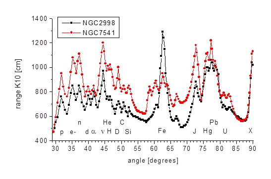 Fig. 1. Spiralgalax NGC 2998. https://theskylive.com/sky/deepsky/ngc2998-object Fig. 2 visar en graf över spektrumet av elementära partiklar och element för rektangeln nr 5 i Fig. 1. Detta fält valdes efter preliminär kontroll av att det finns den högsta nivån för neutrinosignalen, liksom den högsta totala torsionen fältpartikelsignal. 9 Fig. 2. Hela spektrumet för rektangeln markerat på fotot av galaxen NGC 2998 med nummer 5, motsvarande den maximala närvaron av mörk materia, och även för den analoga rektangeln 6 i galaxen NGC 7541. Markeringar: p - protoner , e- - elektroner, n - neutroner, d - deuteroner, α - alfa partiklar, ν - neutrinos, He - helium, H 2 - väte, D 2 - deuterium, C - kol, Si - kisel, Fe - järn, Br - brom, J - jod, Hg - kvicksilver, Pb - bly, U - uran, X - okänd signal. Frånvaroaxel - den infallande strålens vinkel i förhållande till brytplanet, mätt i grader; ordinat axel - område för kategori K10 -strålning från prover vid spektroskopets utgång, mätt i centimeter. 9 Från spektra för periferin av de två galaxerna kan vi se att det finns ganska många neutrinoer där. Men det finns också neutroner. Neutroner lever bara 15 minuter, förfaller till protoner, elektroner och neutrinoer, och mer specifikt antineutrinos. Här kan vi dock inte skilja neutrinoer från anti-neutrinoer, så det är mer bekvämt att definiera neutrinoer i vid bemärkelse. Protoner och elektroner är också synliga. I slutet av tomten, vid gränsen för spektroskopets upplösningskraft, dök en topp upp, som kunde motsvara ett artificiellt element ovanför plutoniummassan. Vi förväntar oss dock inte tunna konstgjorda element i yttre rymden. Detta kan dock vara en annan kandidat för mörk materia, den så kallade WIMP (Weak Interaction Massive Particle). En hypotetisk elementär partikel med en massa på flera till flera hundra protonmassor, verkar genom tyngdkraften och genom en svag interaktion, och visar ingen elektromagnetisk interaktion. Det finns många vetenskapliga teoretiska publikationer om det.2, 10, 11, 12 Egentligen är det ett vanligt namn på flera partiklar med lite olika egenskaper. Våra hittade WIMP är ännu längre från mitten av galaxen än neutrinoer eller järn. Detta visas i diagrammet i fig. 3 hämtat från artikel 9 , där vi ser den starkaste signalen från WIMP på ett avstånd av fem strålar observerade i synligt ljus från galaxen NGC 2998. Fig. 3. Intensiteten hos signalerna från fotot av galaxen NGC 2998 beroende på avståndet från galaxens centrum. Blå rutor - järn (Fe) signal, lila trianglar - jod (J) signal, svarta cirklar - signal av okänt ämne X i slutet av kurvorna i fig. 7. De relativa värdena för de individuella signalerna behölls. Diagrammet visar storleken på galaxen med en optisk ellips. Abscissaxeln - förhållandet mellan avståndet mellan mätfältets centrum från det galaktiska centrumet till galaxens radie, ordinarie axel - intervallet för kategori K10 -strålning från proverna vid spektroskopets utgång, mätt i centimeter. 9 Om sådana partiklar finns i utkanten av galaxen finns det ingen anledning till att du ska försöka hitta dem här på jorden. Mer, i våra kroppar. När vi överväger hur vår kropp fungerar behöver vi minst två nya partiklar för att förstå oförklarliga fenomen. Det är en subtil fråga som är ansvarig för att skapa intryck av vårt medvetande som kallas qualia i filosofin. Detta är ett känt problem med psykofysisk dualitet. När vi drömmer om något produceras inget ljus i hjärnan, och känslor har ingen motsvarighet i den kända fysiska världen utom psyket. Den andra, mindre subtila partikeln behövs för att förklara kraftparanormala fenomen som telekinesis, levitation och böjning av skedar. Torsionsfältpartiklarna klarar inte av skyldigheten att genomföra kraftfenomen, eftersom de inte överför energi, utan endast information. De är associerade med bioenergi terapi och telepati, men de påverkar inte direkt vad som visas i vårt medvetande. När det gäller kraftinteraktioner har vi stor sannolikhet att de kan vara WIMP: er. Finns de i vår kropp? Var ska man leta efter dem? Kanske i strålningen av chakrat på toppen av huvudet, mest förknippat med kosmos? Ett enkelt experiment med att hålla en flaska med vatten i 30 sekunder på toppen av huvudet och sedan kolla på ett spektroskop för att se om det finns en WIMP -signal, visade att det verkligen är det. Först på mig själv, sedan på en vän. Efter att ha opererat med spektroskopet kunde jag bestråla mig själv längre med signalen från galaxer. Resultaten av detta korta experiment visas inte här, det kommer mer detaljerade resultat senare i denna artikel.