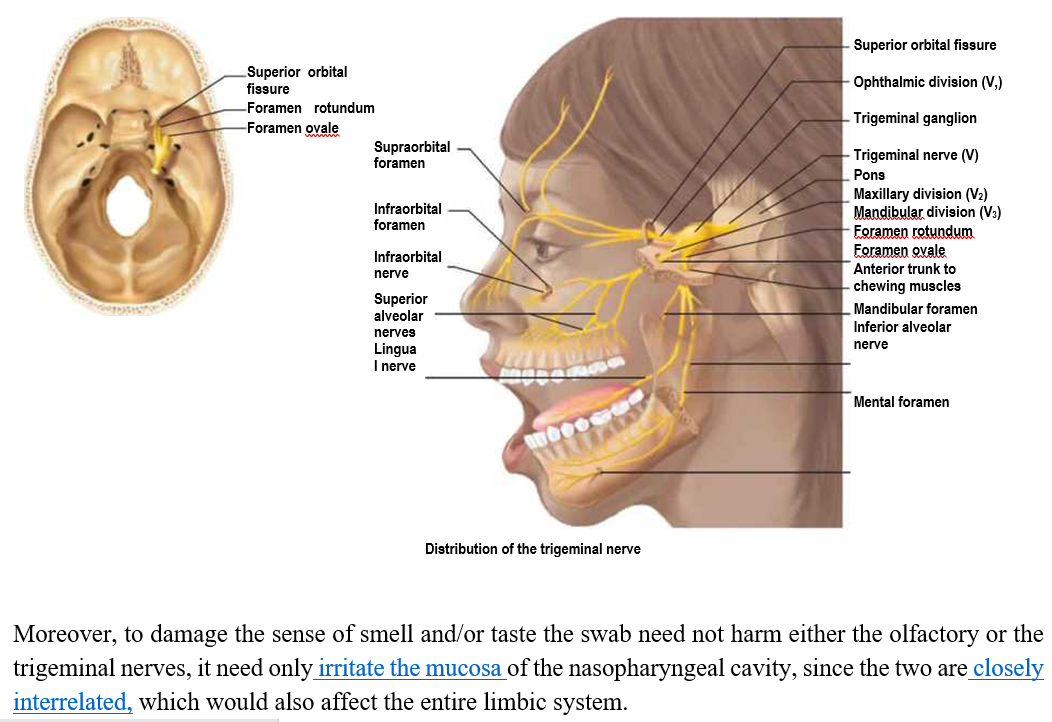 Moreover, to damage the sense of smell and/or taste the swab need not harm either the olfactory or the trigeminal nerves, it need only irritate the mucosa of the nasopharyngeal cavity, since the two are closely interrelated, which would also affect the entire limbic system. |