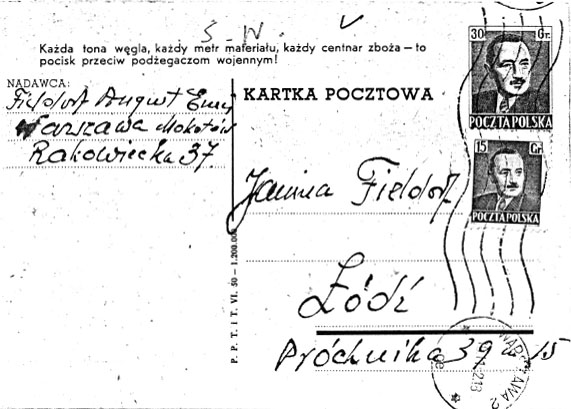 Ojciec napisał do Emila, który dziękował mu za to w krótkiej kartce pocztowej 12. X. 52.: „Kochany Ojcze! Trudno mi opisać jak się bardzo ucieszyłem, kiedy przyszedł list od Ciebie. […]”Kartka do żony: