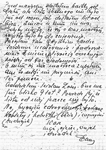 Mnie na razie pieniędzy nie wpłacaj. Przed miesiącem dostałem kartkę od Ciebie, ale listu żadnego nie było już od czasu, jak dostałem list od Ojca. Zmian u mnie nie ma. Gdyby nie to, że się o Was martwię, wszystko byłoby do zniesienia.