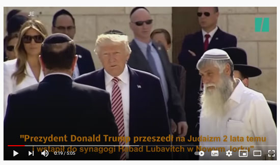 Okazało się jednak, że D. Trump poszedł w swoim serwilizmie jeszcze dalej. Mimo przynależności do kościoła protestanckiego, pozornie chrześcijańskiego choć wymyślonego i całkowicie kontrolowanego przez żydów, postanowił stać się żydem pełną gębą. Niespełna cztery lata temu, w głębokiej tajemnicy przed opinią publiczną, przeszedł na judaizm akurat w wersji Chabat Lubawicz – tej samej, którą wyznaje zięć i zarazem patologicznie nienawidzącej chrześcijaństwa. Dodajmy przy okazji, że David Elias Goldberg, żydowski publicysta, adwokat i działacz społeczny, który ujawnił ten fakt 23 lutego 2019 roku zginął w niewyjaśnionych okolicznościach cztery miesiące później.
