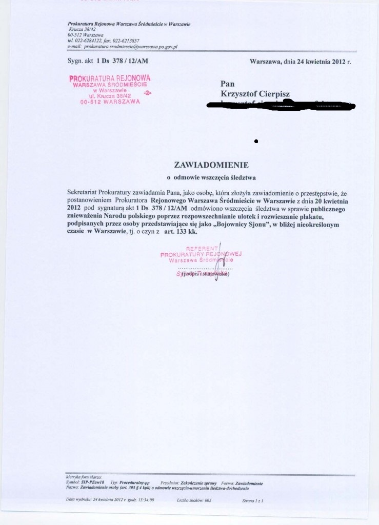 Pismo prokuratury o odmowie wszczęcia dochodzenia
