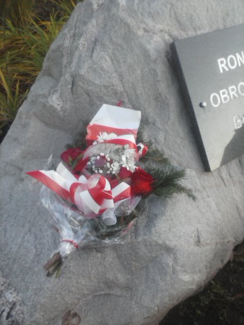 Piękna wiązanka biało - czerwonych kwiatów złożona przed uroczystością przez nieznaną osobę Jacek Boki - Elbląg 1 Grudzień 2019 r.